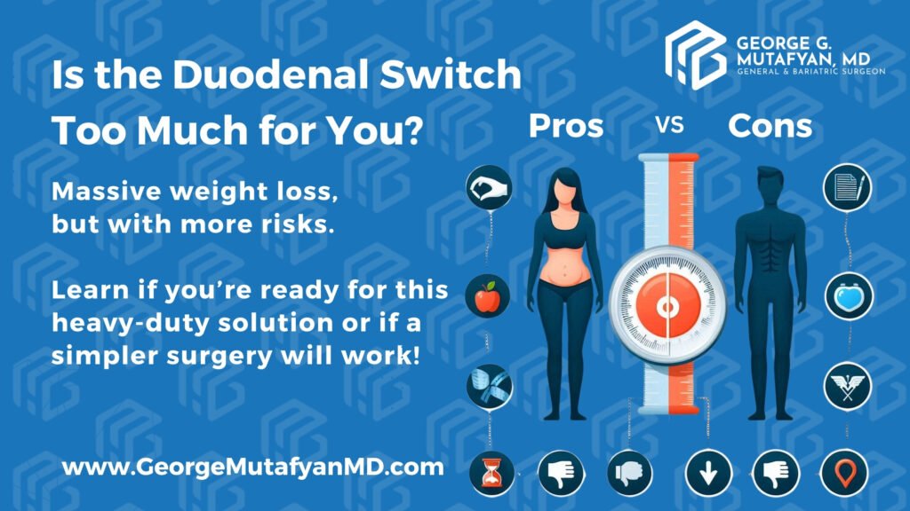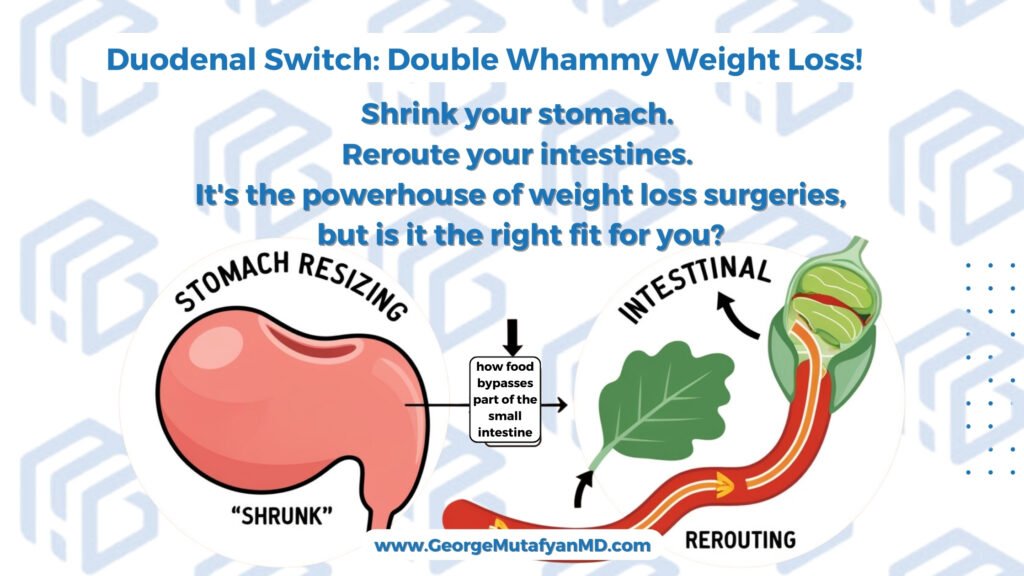 If you’re considering weight loss surgery, you’ve probably heard of the duodenal switch (also known as Biliopancreatic Diversion with Duodenal Switch, or BPD/DS). It’s known for delivering massive weight loss results, but it’s also one of the most extreme procedures out there. Think of it as bringing out the heavy artillery when maybe all you needed was a reliable power tool. And, if you’re lucky enough to be in Los Angeles, Dr. George Mutafyan is one of the best bariatric surgeons around to help you figure out if the duodenal switch is really the right tool for your job—or if a gastric sleeve or bypass might be a smarter (and safer) choice.